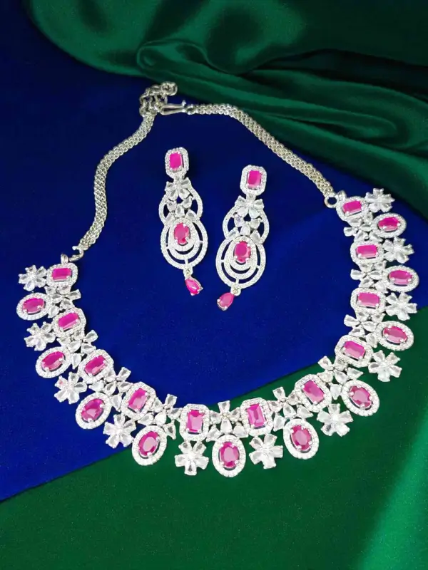 RED CUBIC ZIRCON SILVER TONE NECKLACE SET